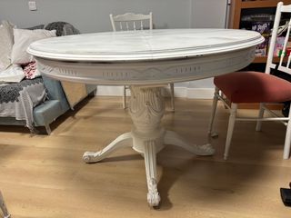 Conjunto de mesa extensible con cuatro sillas a juego, ideal para el salón o comedor. - Mesa con base de pedestal. - Sillas con asientos tapizados. La mesa es extensible de 1,10 cerrada a 1,60 abierta meedidas aproximadas Las sillas hay 3 con la base en tapizado y otra con otro tapizado tienen varioss defectos y la mesa no esta bien la base (necesitaria una reformilla) escucho ofertas. urge vender