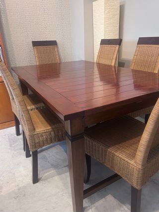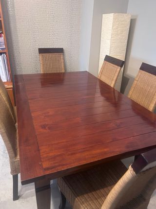 Mesa Comedor Madera Maciza y 6 sillas de ratán