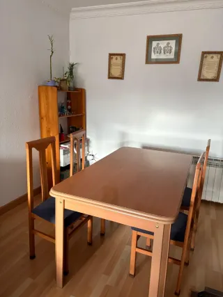 Mesa de comedor extensible + 4 sillas Vendo mesa de comedor extensible en muy buen estado. Medidas: Cerrada: 1,20 m Abierta: hasta 2,00 m Incluye 4 sillas a juego. ✔️ Mesa muy práctica, ideal para el día a día y para reuniones familiares ✔️ Sistema extensible cómodo y funcional ✔️ Conjunto sólido y estable ✔️ Perfecta para comedor o salón Se vende por cambio de mobiliario.