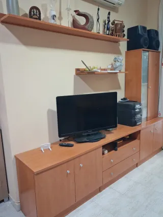 Conjunto de comedor: -Mesa y 4 sillas comedor madera Conjunto de mesa EXTENSIBLE hasta 1,80cm de comedor con cuatro sillas Medidas: 1.20 (largo) x90 (ancho) x75cm (alto) *hay dos sillas que tienen un poco de desperfecto como se ve en la imagen - Mesa de centro de madera con balda inferior. Mide: 1m largox50cm ancho x 50cm alto - Vitrina con diseño moderno.
