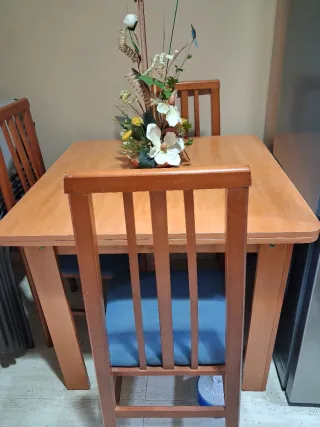 Conjunto de mesa de comedor de madera con cuatro sillas a juego. - Mesa de madera maciza. - Diseño rústico y funcional. - Cuatro sillas de madera a juego. (1 de ellas algo tocada, estoy intentando arreglarla). *Tiene algunos rasguños pero como tiene muchos ribetes al ser madera, no es exagerado.