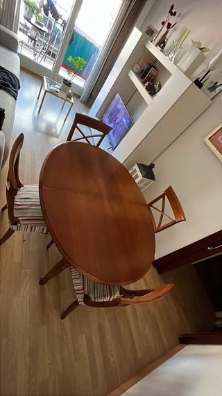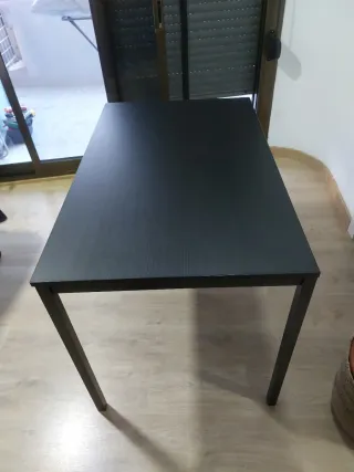 Mesa de comedor extensible de 130 a 190. La mesa está muy bien. La vendo muy barata por traslado urgente y donde voy no me la puedo llevar. - Tablero de madera oscura. - Patas de madera resistentes. - Tengo 4-5 sillas de conjunto