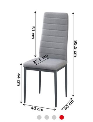 Las 6 sillas a juego son el complemento perfecto para la mesa. Tienen una estructura de acero resistente y un acolchado suave para garantizar una experiencia comoda al sentarse. Ademas, se ajustan perfectamente a la mesa, lo que garantiza una estetica uniforme en el conjunto de la sala de comedor. Facil montaje. Medidas Mesa: Alto: 74 cm Ancho: 80 cm Largo: 140 cm Medidas Silla: Alto: 95.5 cm Ancho: 40 cm Profundidad: 4 cm