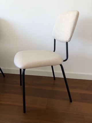 Conjunto de cuatro sillas de comedor con un diseño moderno y elegante de la reputada marca Kibuc. - Tapicería en tela de color beige claro y con una ergonomía muy cómoda para estar a gusto sentado. - Estructura de patas metálicas negras, el respaldo a diferencia de la gran mayoria esta enfundado, con lo cual no se ve ningún hierro trasero, dotándola de más elegancia y diseño. - Absolutamente nuevas sin estrenar (doy mi palabra y totalmente comprobable en la entrega). Precio NO negociable