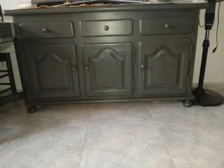 Mueble de comedor de estilo clásico en color gris restaurado. Cuenta con tres cajones en la parte superior y tres puertas en la parte inferior. 150x45x85 - Tres cajones con tiradores. - Tres puertas con tiradores. - Diseño con molduras. + Mesa con 4 sillas también color gris. 160x80x80 + Mesa auxiliar de centro. 100x50x45