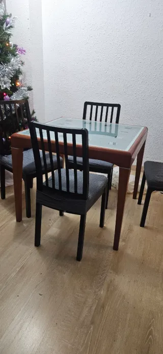 Conjunto de mesa de comedor con cuatro sillas a juego. Ideal para espacios acogedores. - Mesa con sobre de cristal y estructura de madera. - Sillas de diseño moderno con asiento tapizado.