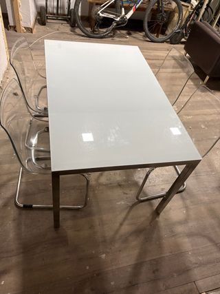 Mesa de comedor con un diseño moderno y funcional. Tiene algún desperfecto, pero nada que una manita de pintura no pueda arreglar. No incluye sillas. - Superficie de cristal. - Patas de metálicas. - Medida 120cm y extensible a 160 / 210cm para adaptarse a tus necesidades. - Hasta 10 comensales.