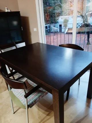 Conjunto comedor - mesa con 4 sillas de madera maciza y cojines a juego. Precio inicial ~600€. Conservada en muy buen estado. Tienda Bonart de Cornellá, mobiliario gama alta. - Mesa de diseño - Medida 1.60m x 1m x 0.70m de alto - Diseño moderno y robusto. - Madera de wengué Precio negociable.