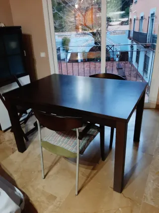 Precioso conjunto de mesa y cuatro sillas de madera maciza torneada , de la tienda Tú Decora , perfecto estado, la compré hace un año y medio y apenas uso.....medidas de 120×80, es extensible a casi dos metros.... Es ideal para espacios pequeños ya que la mesa cerrada son 120cm, solo la mesa nos costó 870e comprada hace año y medio