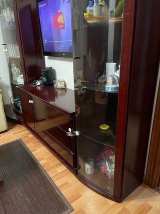 Conjunto de mueble de comedor en madera de cerezo, con vitrinas y cajones. - Mueble de madera maciza. - Diseño clásico y elegante. - Incluye vitrinas con puertas de cristal. - Dispone de varios cajones para almacenamiento. SE VENDE POR SEPARADO MESA Y 6 SILLAS: 100 MESA CENTRO: 40 MUEBLE - VITRINA: 80