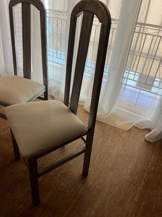Conjunto de 6 sillas de madera en muy buen estado. Está en Valle de la Serena. Son perfectas para comedor o cocina. Dos de ellas son con asiento en tela verde y una de estas dos esta desvencijada. El resto están perfectas. - Estructura de madera robusta. - Tapicería beige en buen estado.