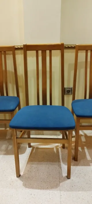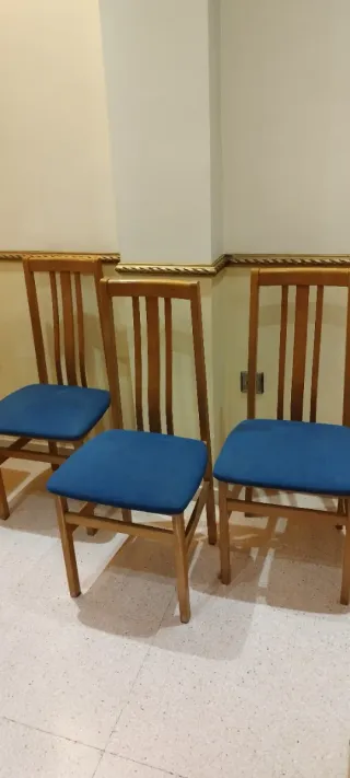 Conjunto de tres sillas de comedor con asientos tapizados. El precio es por las tres❗ - Estructura de madera. - Asientos de tela azul.