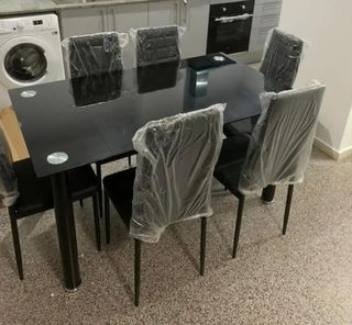 mesa y moderna elegante juego de 6 sillas y mesa mesa de cristal templado el cual le garantiza un nmayor soporte y sus sillas son de estructura metalica forrada en polipiel disponemos en blanco gris o negro Precio: 220€ Envío incluido Pago contrareembolso