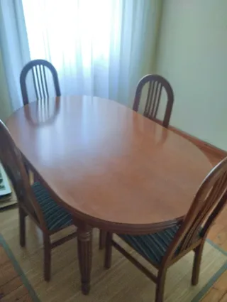 Juego de cuatro sillas y una mesa extensible de madera, un metro de diámetro. Color miel, en muy buen estado, con tableta central escamoteable (aprox. 30 cm.) para ampliar el sitio para 6 personas con mucha comodidad. El asiento de las sillas en cordel protegido, en perfecto estado. Se lleva y monta gratuitamente en Bilbao y alrededores.