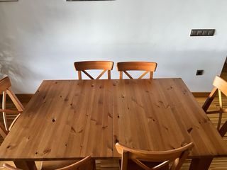 Conjunto de mesa de comedor extensible y 6 sillas de madera. - Mesa de madera con acabado natural, largo normal 148cm. Extendida 205cm. - Diseño extensible para mayor capacidad. - Sillas de madera con respaldo cruzado.