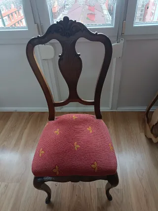 Vendo 8 sillas de comedor, todas iguales. Están en buen estado, son cómodas y están firmes, no cojean. Tapizadas en tonos rojo, beige y negro, con patas de madera oscuras. Ideales para un comedor grande, casa en el pueblo, segunda vivienda o casa rural. ¡¡Se venden todas juntas, no por separado!! Recogida en mano. Cualquier cosa, pregunta sin problema.