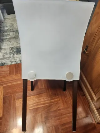Conjunto de sillas de comedor con un diseño contemporáneo. - Asiento y respaldo en plástico blanco translúcido. - Patas de madera oscura. - Detalles metálicos circulares en la unión del asiento y las patas.
