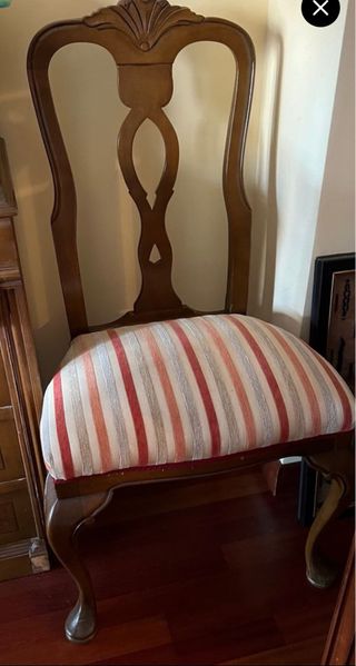 Conjunto de sillas de comedor con un diseño elegante y cómodo asiento, Robustas. El precio rebajado es porque Tienen algunos pequeñitos orificios de polillas, fácilmente reparables con pasta. - Estructura principal de madera. - Tapicería de tela con rayas multicolores.
