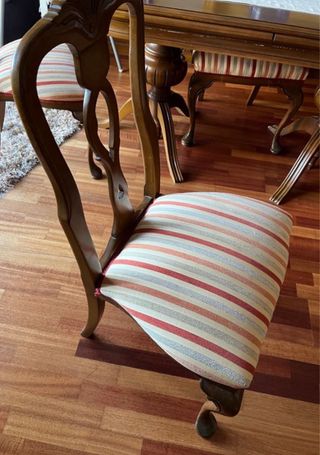 Venta en Madrid zona las Ventas mesa extensible, cuatro sillas y dos sillones. - Mesa de madera oscura. - Sillas y sillones con tapicería a rayas.