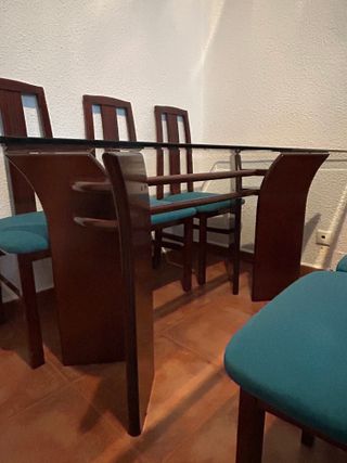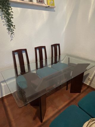 Mesa de comedor extensible con tapa de cristal y estructura de madera de nogal. Incluye seis sillas a juego.150*90,230*90 negociable. No mando - Diseño moderno y funcional. - Acabado en nogal. - Tapa de cristal resistente.