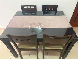 Conjunto de mesa con sobre de cristal y cuatro sillas de comedor. - Mesa con estructura de madera y patas negras. - El cristal tiene algunos arañacillos sin importancia del uso de poner cosas encima pero a penas se notan - Sillas tapizadas en tela gris como nuevas - Diseño moderno y elegante.