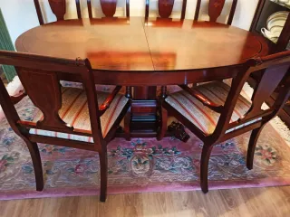 Elegante conjunto de mesa de comedor ovalada y seis sillas a juego. Ideal para crear un espacio acogedor en tu hogar. - Mesa de madera oscura con detalles. 1'64 cerrada y 2'09 abierta - 4 sillas de madera con asientos y 2 silloncitos tapizados.