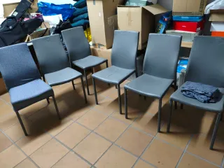 Conjunto de seis sillas de comedor con un diseño moderno y elegante. Evidentes signos de desgaste. Son muy comodas con sistema basculante. - Tapicería piel sintetica. - Patas metálicas.