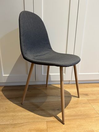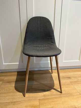Pack de dos sillas de comedor con un diseño moderno y elegante. - Asiento y respaldo tapizados en tela gris. - Patas de metal estilo madera. -Incluye 2 fundas de color tostado. -Los tacos de las patas están un poco gastados del uso. En muy buen estado, siempre usadas con funda.