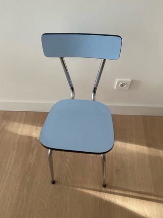 Silla de estilo vintage, perfecta para cocinas o comedores. - Asiento y respaldo en color azul. - Patas y estructura de metal plateado. - muy comodas y ocupan poco espacio - perfectas para amantes del toque retro - disppnemos de 3 unidades. precio por unidad.