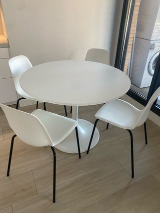 Conjunto de mesa redonda con un diseño moderno y cuatro sillas. - Mesa con base tipo pedestal. - Sillas con asiento de plástico. - Patas de las sillas de metal negro.