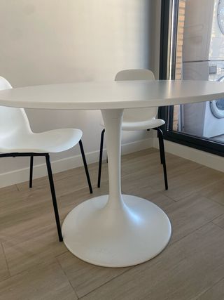 Conjunto de mesa de comedor con superficie de cristal y cuatro sillas.se pueden vender las sillas por un lado y mesa por otro. - Mesa con patas metálicas cromadas. - Sillas tapizadas en piel sintética color blanco. - Diseño moderno y elegante. - hay que recogerlas en la calle embajadores, Madrid.