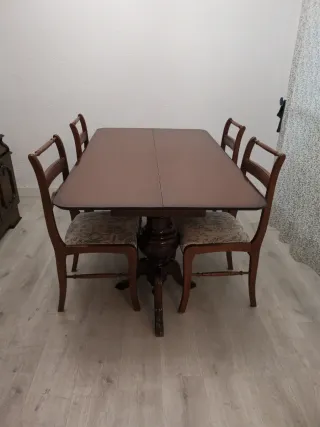 Conjunto de mesa de comedor y seis sillas. - Mesa de madera maciza con acabado oscuro. - Sillas con estructura de madera y asiento tapizado en tela. - Diseño clásico y elegante. Medidas de mesa: 120 diametro cerrada 160*120 abierta Si eres manitas con un poco de restauracion quedaria espectacular, era mi idea, pero no saco tiempo. Las sillas estan muy bien, pero necesitan un encolado para reforzarlas para que esten perfectas, la madera esta perfecta.