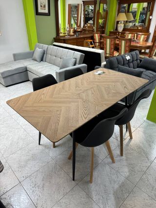 Elegante mesa de comedor con un diseño contemporáneo que combina materiales de calidad, las sillas también están incluidas. - Tablero de madera con acabado natural. - Patas de metal negro. medidas: -Largo 145 cm -Largo con extensión 205 cm -Ancho 90cm