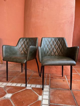 Modernas sillas con un diseño acolchado y elegante. Perfectas para añadir un toque de estilo a tu comedor o escritorio. - Tapicería con acabado capitoné. - Patas metálicas resistentes.
