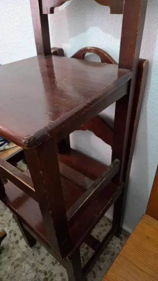Sillas de comedor de madera. - Acabado en tono marrón oscuro. - Estructura robusta de madera. Algo desgastadas pero se pueden lijar y pintar. 10€ por silla o 28€ x 3 sillas Escribeme sin compromiso a mi wasap 630523937