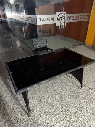 Preciosa mesa extensible de diseño contemporáneo. Estructura robusta de metal negro mate con superficie de cristal templado transparente. Con sillas 150, sin sillas 120 ✅ Medidas: 123 cm cerrada / 246 cm abierta ✅ Dos cristales extraíbles (fáciles de limpiar y transportar) ✅ Cada cristal apoyado sobre 4 soportes de goma antideslizantes ✅ Sistema de extensión modular y funcional ✅ Estilo minimalista/industrial ✅ Estado impecable, sin rayaduras ni desperfectos Ideal para comedores grandes o salones. Gran calidad de materiales. Precio negociable.