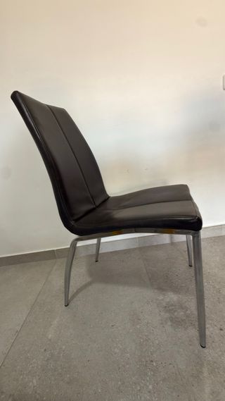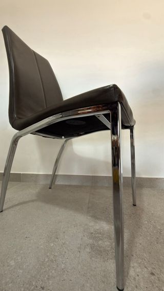 Se venden cuatro sillas con un diseño moderno y elegante. Son perfectas para complementar tu comedor o espacio de trabajo. - Tapicería en polipiel. - Patas de metal cromado. Requieren re tapizar.
