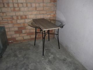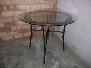 Elegante mesa con sobre de cristal y estructura de hierro forjado. Un poco desgastada por el tiempo negociable.