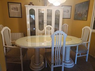 Conjunto de comedor (madera maciza) en color blanco, ideal para dar un toque elegante a tu hogar. Se encuentra en buen estado. Marca Añón Querol. - Mesa de comedor ovalada con sobre de cristal. (2m largo x 1,80 ancho) - 4 sillas y 2 sillones de comedor a juego con asientos tapizados -Vitrina: 1,90 alto x 1,60 ancho x 0,45 prof. - Aparador con espejo: 2,60 largo x 0,90 alto x 0,50 profundo.