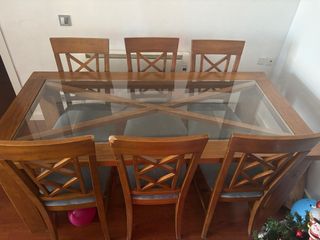 Conjunto de mesa de Nogal para comedor de madera maciza con tapa de cristal y seis sillas a juego. - Diseño elegante y robusto. - Sillas con asientos tapizados en gris. - Ideal para salones amplios. Dos sillas con un poco de desperfecto visual por un perro que tenia, pero esta en buen estado