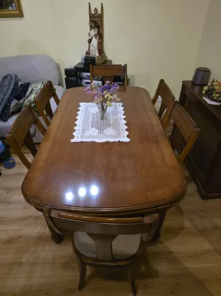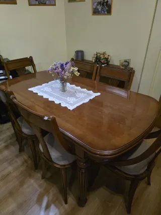Juego de comedor de estilo clásico y elegante en madera oscura con sillas retapizadas. El conjunto incluye una mesa extensible robusta de esquinas redondeadas y 6 sillas a juego. • Estado: Muy bueno. La madera está muy bien conservada ya que se le realizó un proceso de lacado hace un año y el tapizado de las sillas (en tonos verde suave) está limpio y firme (también retapizadas recientemente). • Detalles: Ideal para salón o comedor. Las sillas tienen un respaldo alto muy cómodo. 📏Medidas de la mesa sin extender: 123 cm de largo x 85 cm de ancho. 📏Medidas de la mesa extendida: 246 cm de largo x 85 cm de ancho.