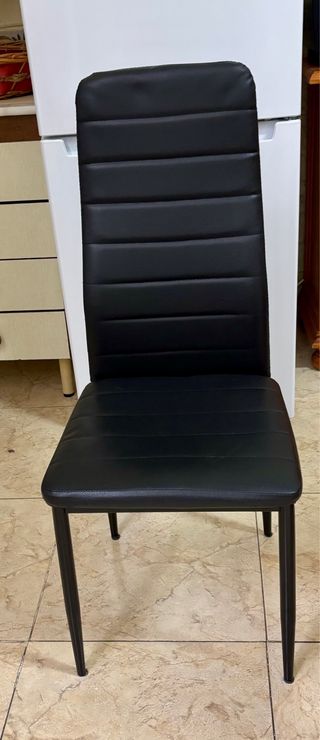 Conjunto de ocho sillas de comedor en excelente estado. Son cómodas y elegantes. - Diseño moderno con líneas rectas. - Patas metálicas resistentes. - Tapizado en polipiel.