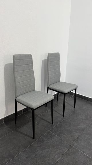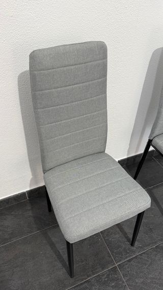 Set de cuatro sillas de comedor, nuevas. No han sido usadas. Su diseño moderno se adapta a cualquier espacio. - Tapicería de tela gris. - Patas metálicas negras. Se venden 2 montadas y 2 desmontadas. Todo lo necesario para montarlas viene incluido. Se venden por equivocación en las medidas.