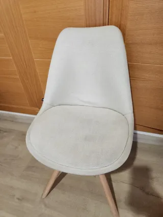Silla de comedor con un diseño moderno y elegante. - Patas de madera natural. - Tapizado en tela de color beige. Nada roto ni descosido. Buen estado general