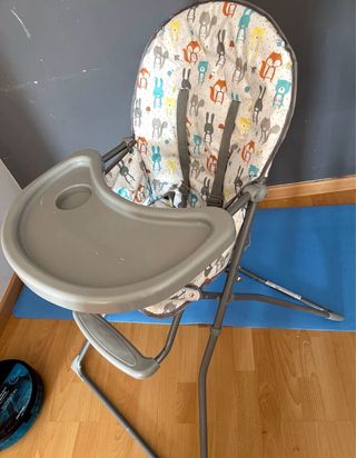 Silla de comedor para bebés y niños pequeños con un divertido estampado. - Cojín acolchado con diseño de animales y setas. - Bandeja extraíble. - Arnés de seguridad de 5 puntos. - Estructura plegable para fácil almacenamiento.