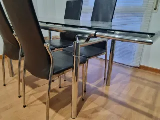 Elegante mesa de comedor extensible con superficie de cristal y estructura metálica con 4 sillas incluidas. Extensible hasta 200 cm (cada extensión lateral son 30 cm) - Diseño moderno y funcional. - Extensible para adaptarse a tus necesidades. - Patas de metal cromado.
