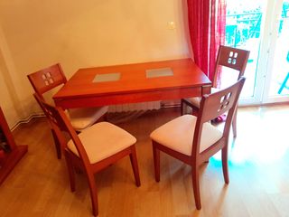 Conjunto de mesa de comedor de madera de cerezo con cristal y cuatro sillas. La mesa tiene un diseño sencillo y elegante. Las sillas son cómodas y están tapizadas en un tejido blanco roto - Ideal para espacios pequeños. - Perfecto estado de conservación. - Se incluye la mesa y las cuatro sillas. Mide 1,20 M y extendida 1,5 M. Regalo las fundas para las sillas en el mismo tono que su tapicería. Recoger en persona.