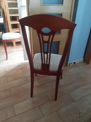 Se venden 4 sillas de comedor de madera color cerezo y tapizadas en tela chenilla de fácil limpiado. Son sillas resistentes y están en buen estado. No se envían. Precio por unidad.