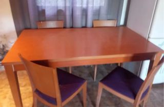 Mesa de comedor extendible... La mesa extendida mide 224cm. Como ven en las fotos las sillas están bastantes gastadas, pero nada que no se pueda arreglar, se forran y quedarían como nuevas. Lo vendo por falta de espacio la mesa esta bien en buen estado, fácil de extender.
