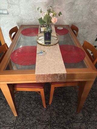 Preciosa mesa de comedor ovalada con sobre de cristal y 4 sillas de madera y tela. La mesa está en muy buen estado y las sillas son cómodas y elegantes. Se venden juntas. - Mesa de cristal con base de madera. - Cuatro sillas con estructura de madera y tapizado rojo. - Estilo moderno y atemporal.